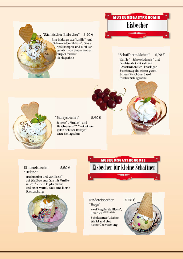 Kirsch- , Pfirsich- und Schokoeis mit Sahne und Früchten der Saison